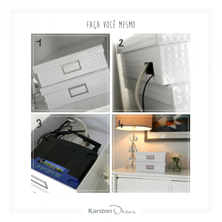 #DIY #Dicas #Decor Fios carregam qualquer ambiente, não é mesmo? Uma caixa de papel com alguns furos pode esconder fios, carregadores, modems e extensões com muito charme e ainda agregar cor e textura à decoração! Super fácil de colocar em prática!